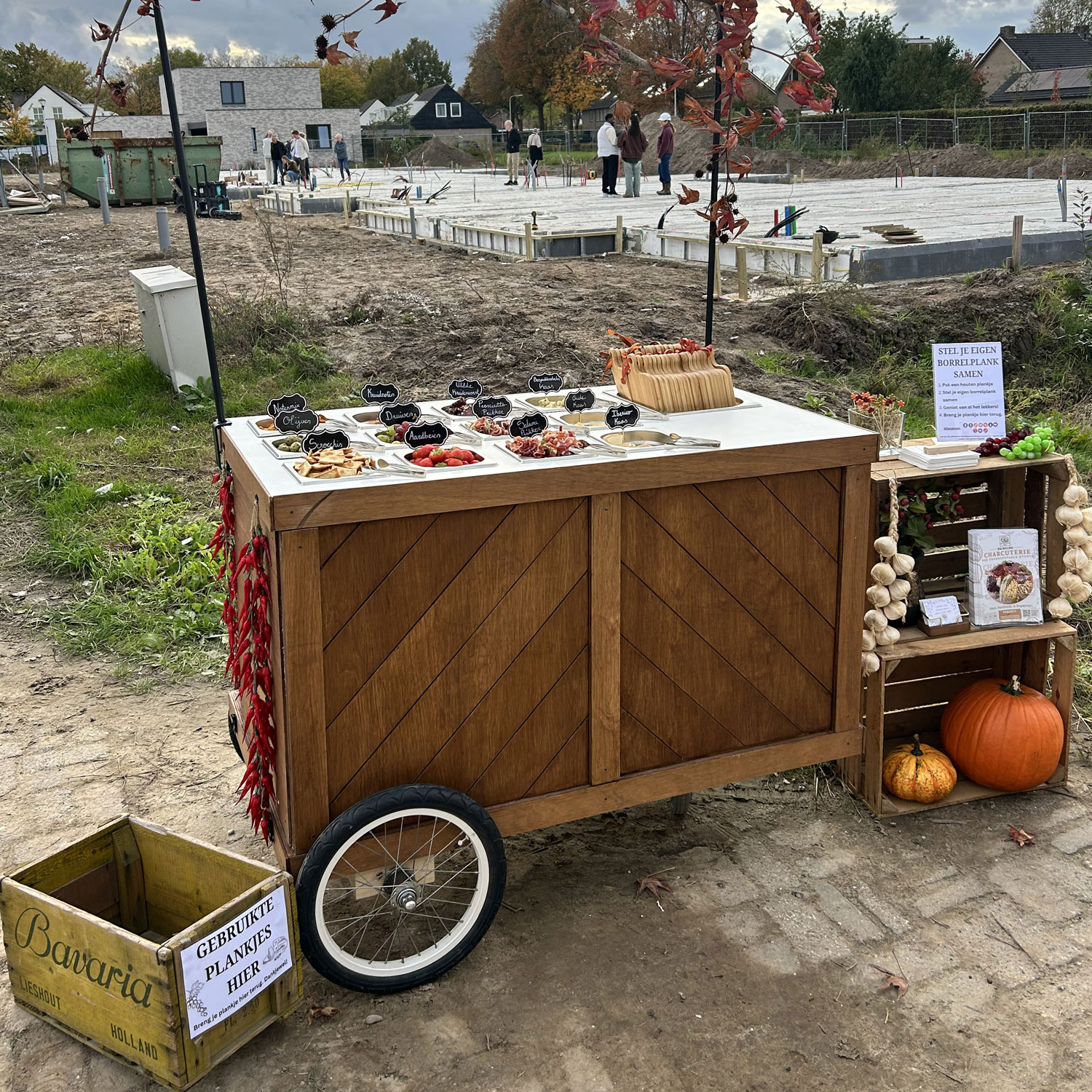 A unique team-building or event activation. Our beautifully designed mobile wooden cart allows guests to craft their own small charcuterie board, creating an engaging and memorable catering moment.