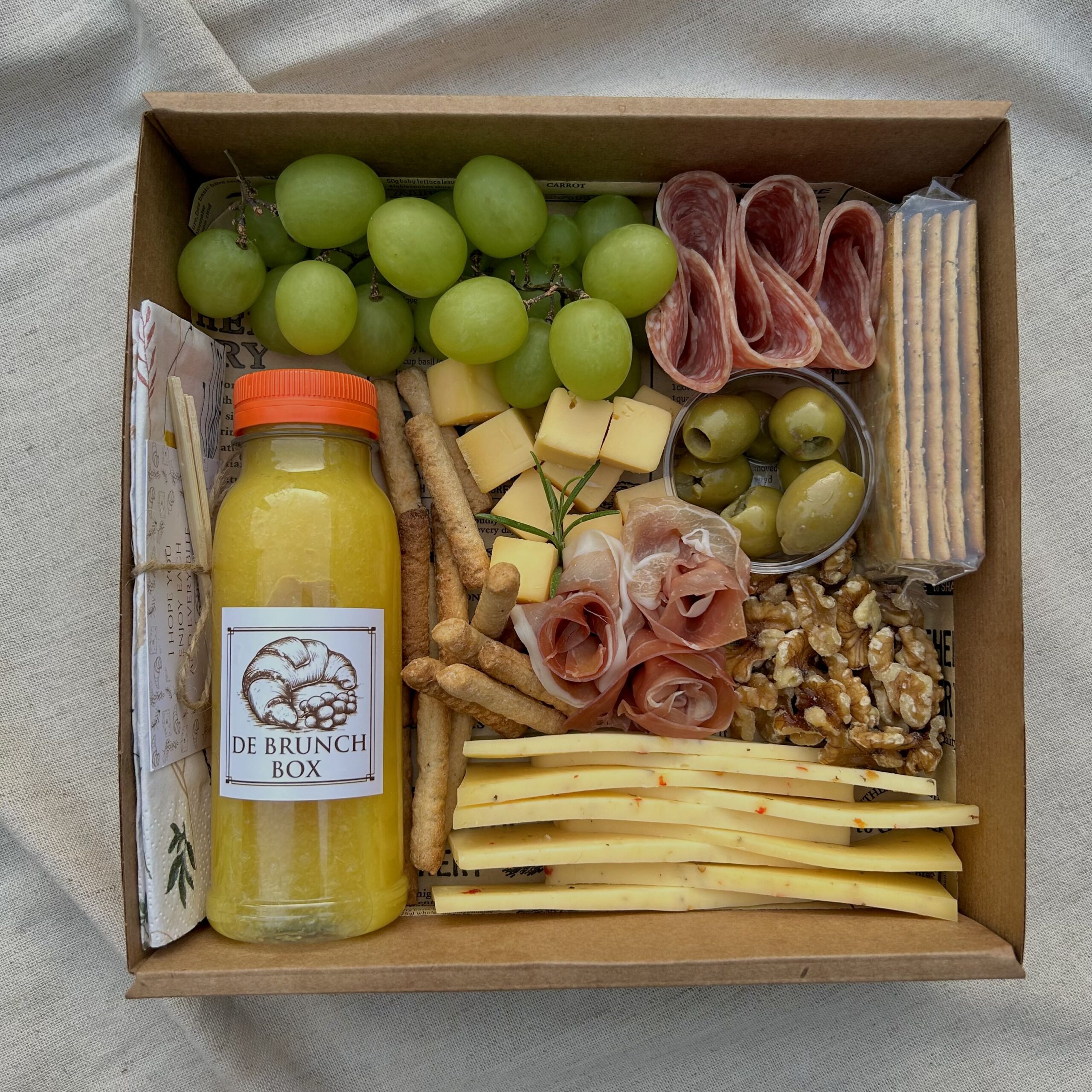 Indulge in a taste of Spain with our Tapas Brunch Box! Savor toasted bread with homemade tomato spread, alongside authentic Serrano ham, savory fuet, and artisanal cheeses.