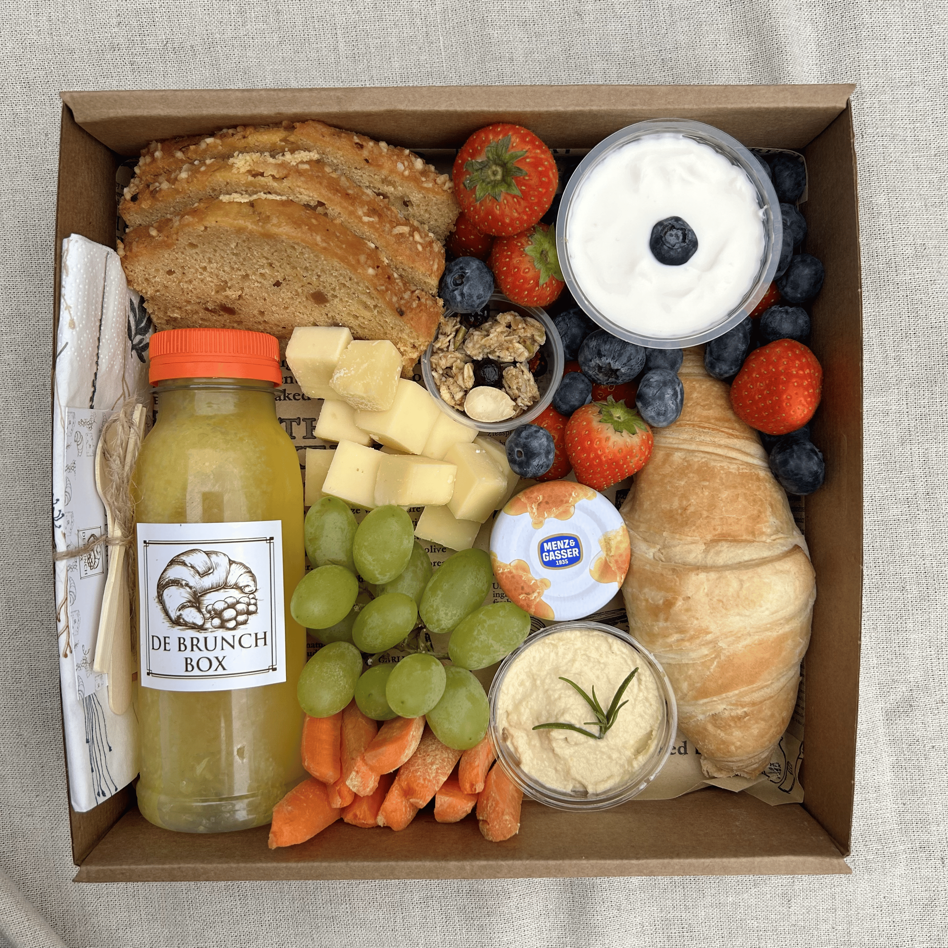 Complemented by creamy yogurt topped with crunchy granola, a selection of berries, a fluffy pastry, and smooth hummus with carrots, this box has everything for a balanced and delicious treat.