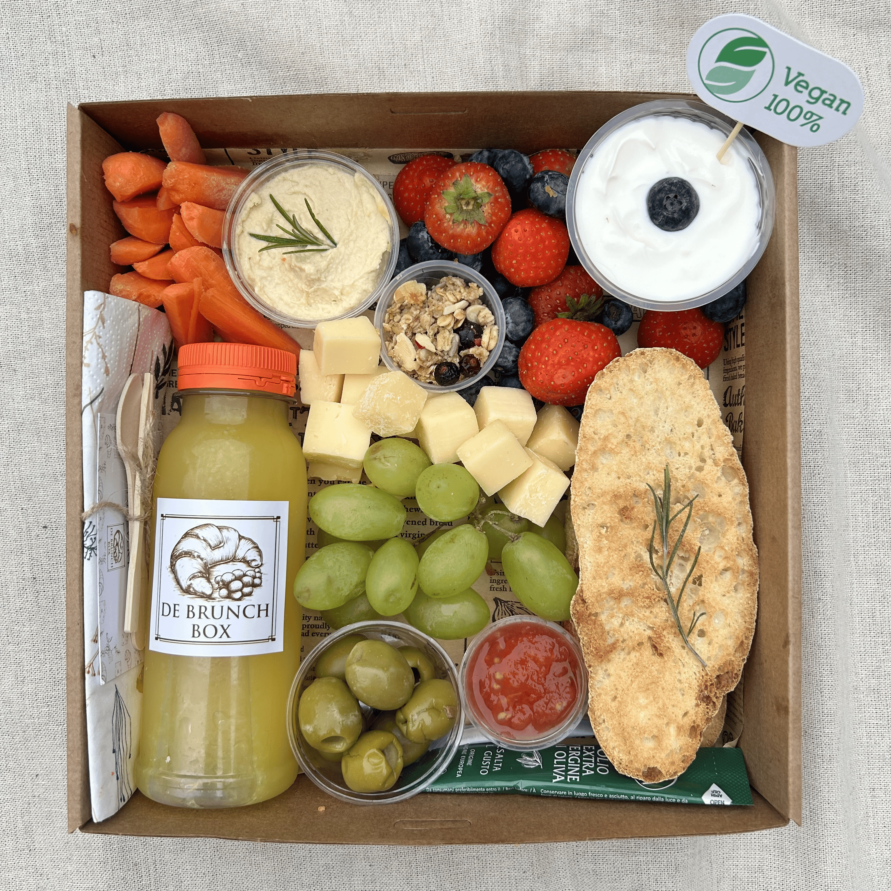 Enjoy toasted bread with homemade tomato spread, creamy hummus paired with fresh celery and carrot sticks, and a vibrant selection of berries and grapes. This box can include vegan yogurt topped with granola, vegan cheese, and crisp crackers for a balanced and flavorful experience, along with refreshing juice to complete the spread.